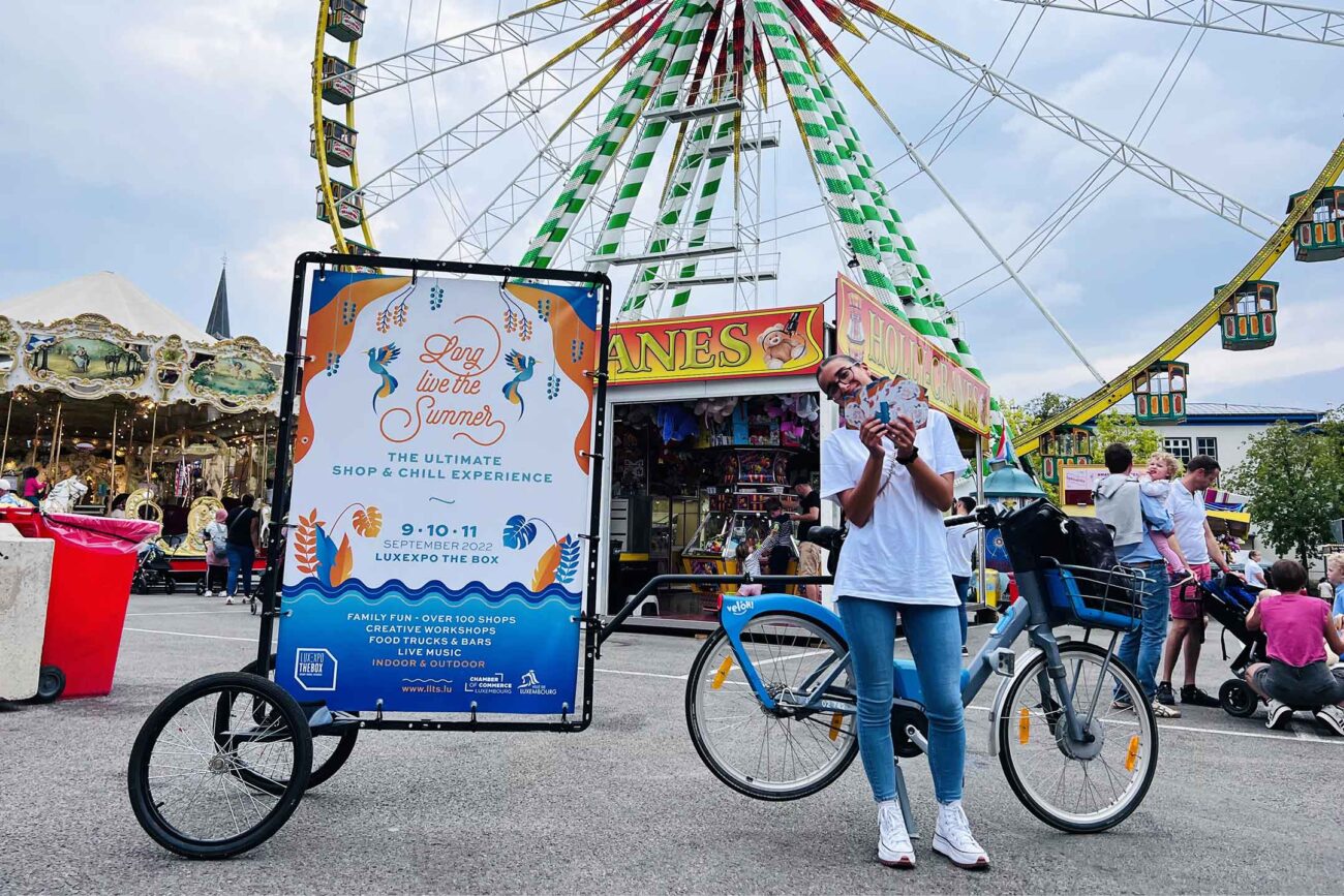 Pour faire la promotion de l’événement, les bikers CD PUB et leur « Vélo pub » ont sillonné les rues de Luxembourg-ville durant 3 week-ends avec une escale à la Schueberfouer pour plus de VISIBILITÉ.