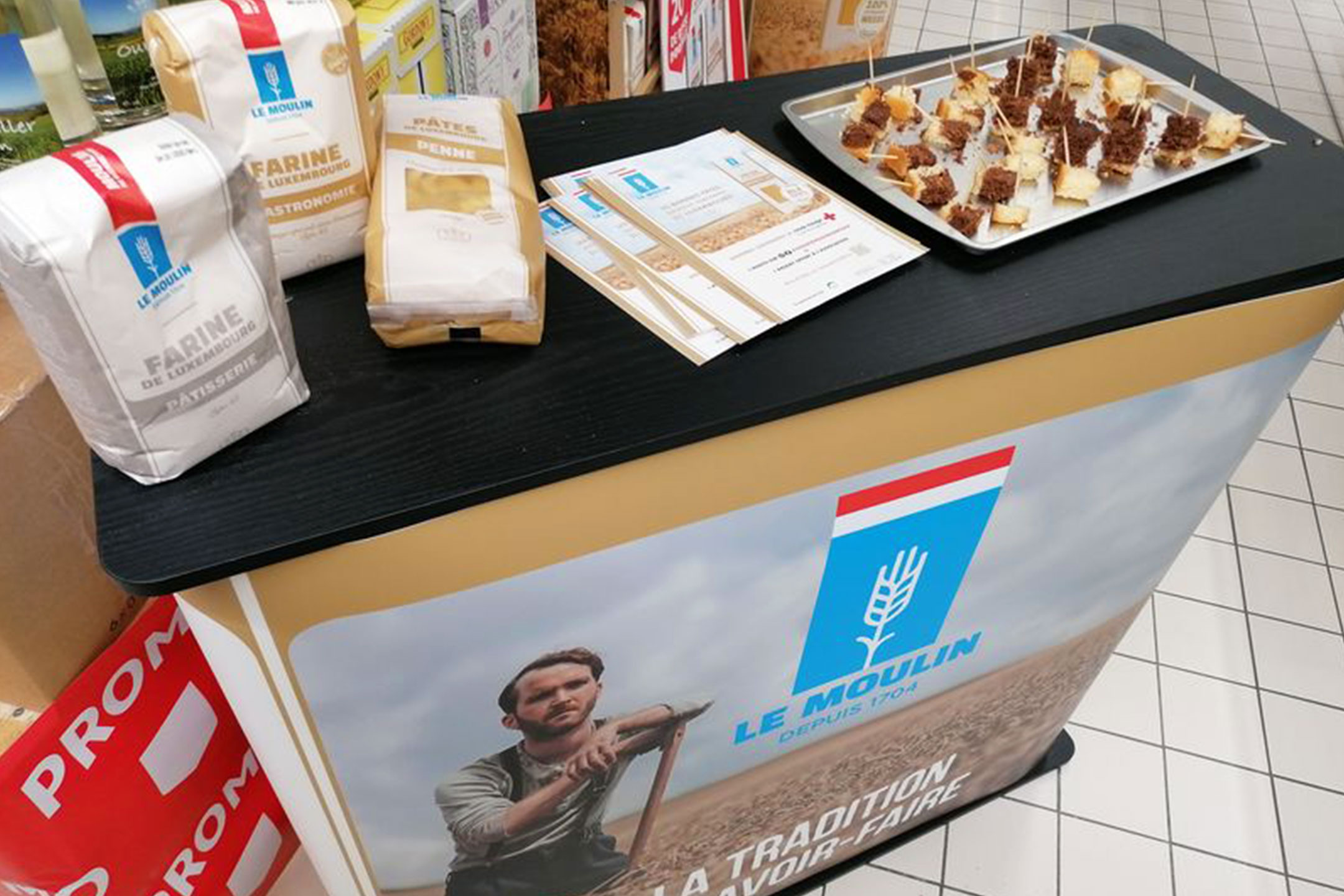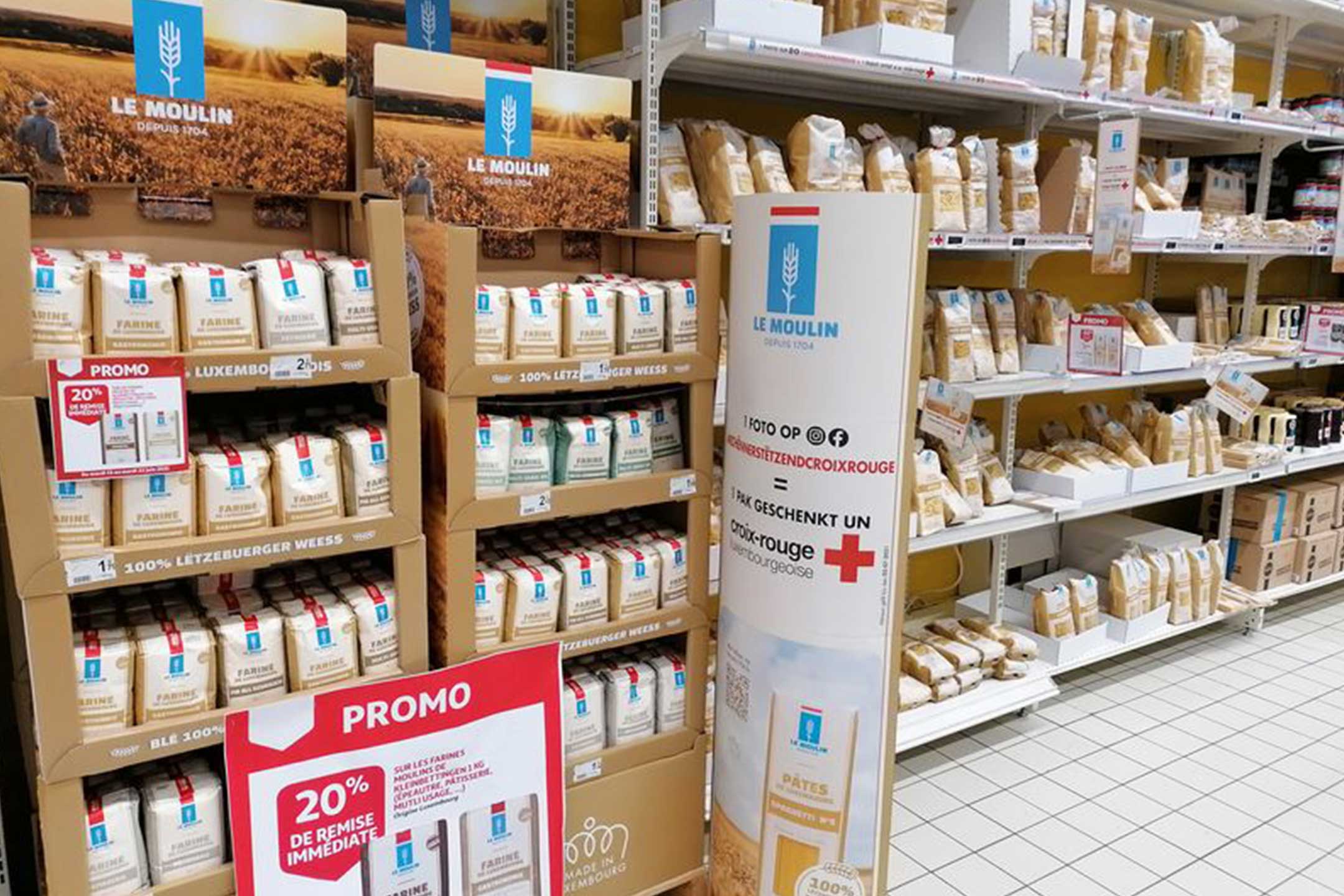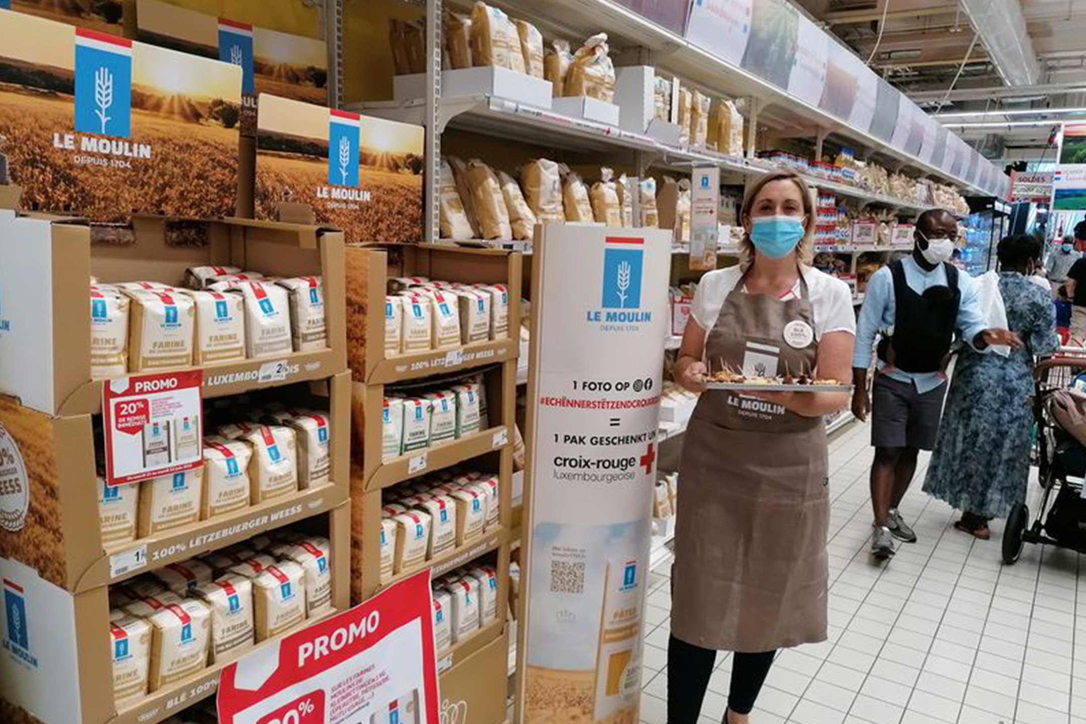 Recipients of the pasta packages were invited to share the action by posting a photo on social media, and for each photo posted, the Moulins de Kleinbettingen pledged to donate a package of pasta to the Red Cross. This original and charitable initiative was shared in-store by our host, who offered a tasting of small cakes.