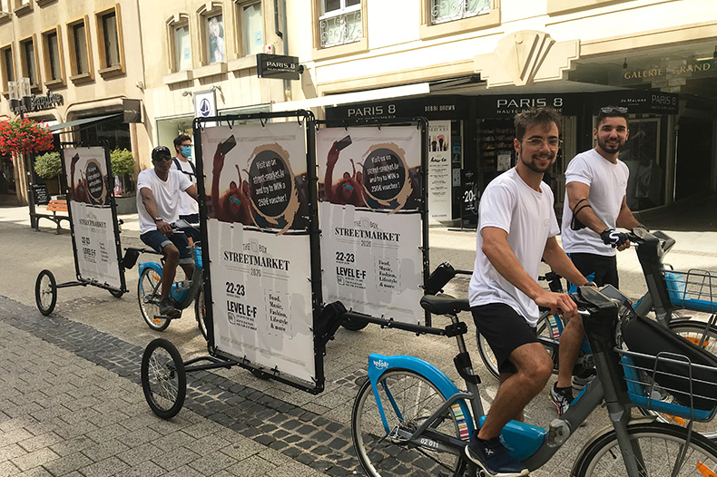 This time it was a brand activation in the context of an event , here in this case a particular context since it was the first edition of a new event entirely redesigned by Luxexpo for the resumption of post-confinement events in Luxembourg (like an outdoor market). Street marketing and in particular mobile displays established themselves as one of the solutions to promote this event by crisscrossing the streets of Luxembourg City with our 3 “advertising bikes” and capturing the attention of as many passers-by as possible with the possibility of winning exclusive vouchers of €250, €150 or €100.