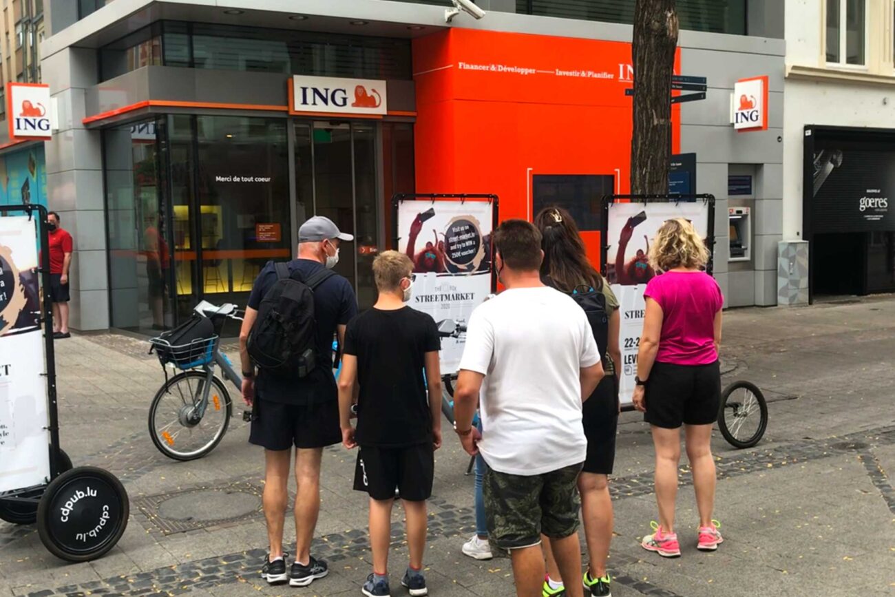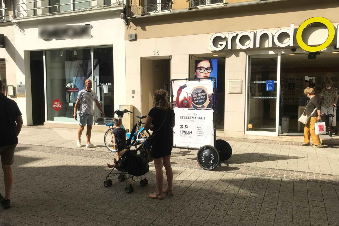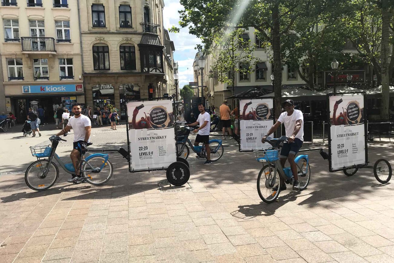 3 advertising bikes and 3 bikers were therefore mobilized for 6 days to crisscross the streets of Luxembourg City . The route was defined according to peak times and around ten strategic stopping points were defined in order to capture the attention of as many passers-by as possible (squares, café terraces, pedestrian intersections, etc.). Many interested passers-by took photos of the advertising display.