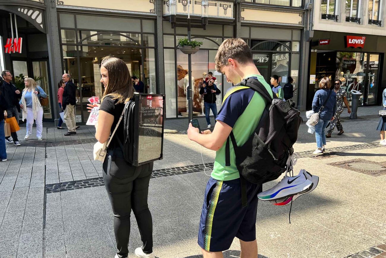 To relay the interactive game to the “field,” i.e., in the city center, we needed a support that was both digital and mobile. The digital backpack was an obvious choice! LIFE EXPO provided us with the promotional video that would be broadcast on our screens, and we designed an interactive game whose objective was to digitally scratch a card that revealed the potential prize.