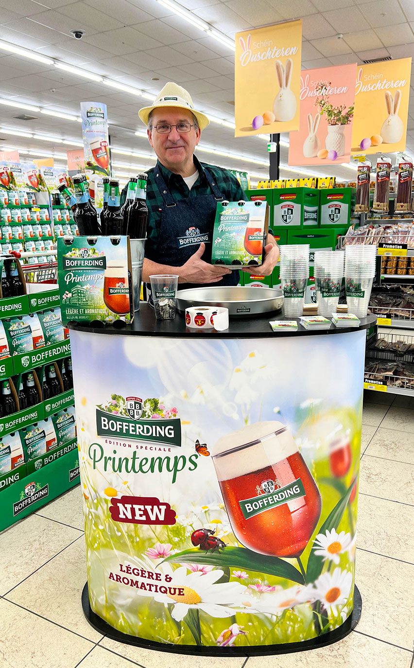 The theatrical presentation of the new “Bofferding Printemps” beer transformed the shelf into a veritable celebration of spring, with a brightly decorated counter and captivating branding elements. The immersive atmosphere created by the host and the decorations reinforced the appeal of this special edition, generating interest and active participation from customers.
