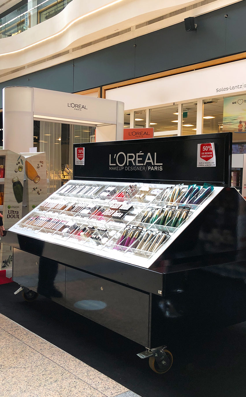 The goal was to maximize the visibility of L’Oréal beauty products while boosting sales through a strategic approach. A carefully designed pop-up store was created, combining drama and impactful merchandising. The stand, designed to maximize the appeal of the makeup and skincare lines, captured visitors’ attention thanks to its ergonomic layout and striking visuals.