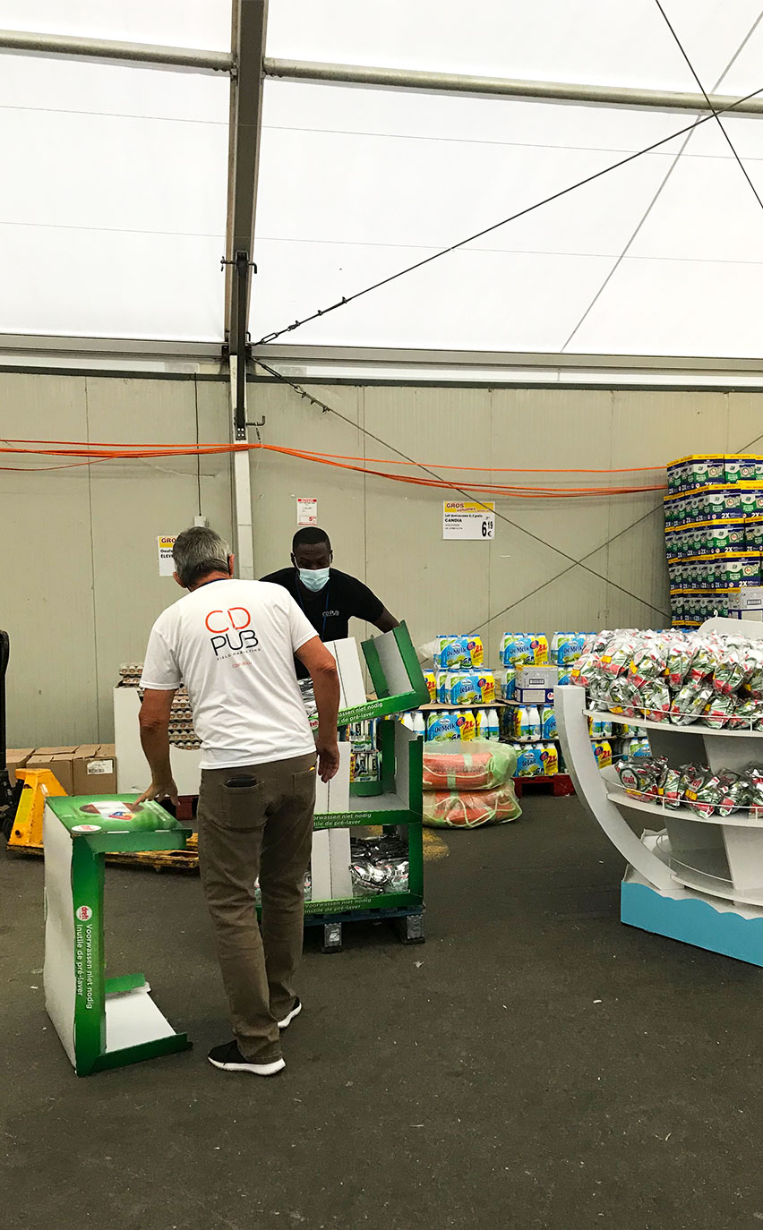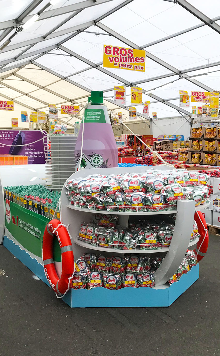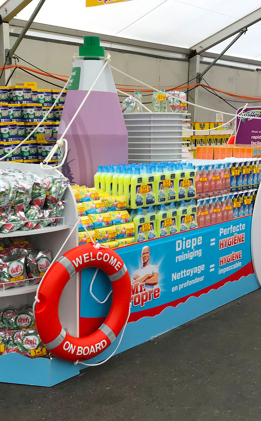Under the “Large Volumes” marquee at Cora Foetz, our merchandisers have staged a superb “promos” cabinet in the shape of a boat, dedicated to the brands Dreft, Antikal, Ariel, Swiffer and Mr Propre…. Their meticulous work guarantees a theatrical presentation that attracts all eyes and maximizes the visibility of the products. A “wow” effect guaranteed!