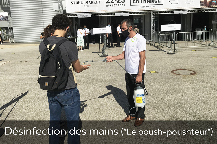 💪 La désinfection des mains : posté à l’entrée des commerces ou des manifestations diverses (foires, salons, expositions), le poush-poushteur (oui c’est comme ça qu’on le nomme !), agit comme une barrière entre le monde extérieur et l’intérieur du commerce ou de la manifestation, en incitant les gens à se désinfecter les mains avec une solution hydroalcoolique.