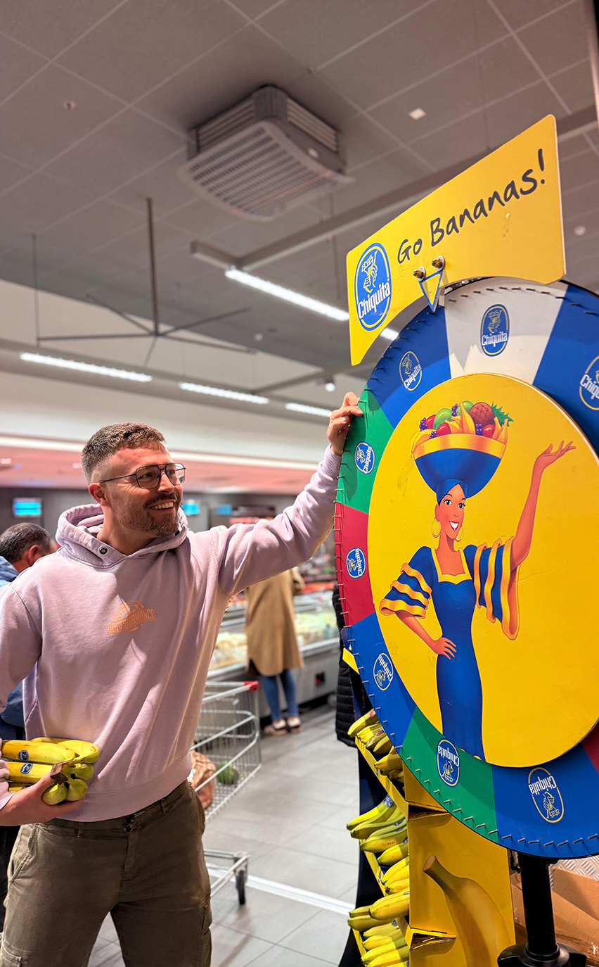 L’objectif de cette campagne d’expérience de marque était clair : renforcer la notoriété de Chiquita et positionner ses bananes comme la collation idéale du quotidien. Grâce à nos animateurs et animatrices professionnels, l’univers frais, ludique et énergique de Chiquita World a pris vie dans les rayons des enseignes partenaires, captivant petits et grands. L’opération s’est articulée autour d’une approche sensorielle et engageante, combinant mise en avant produit, jeux interactifs tels que la célèbre roue de la fortune Chiquita, et distribution de lots promotionnels aux couleurs de la marque.