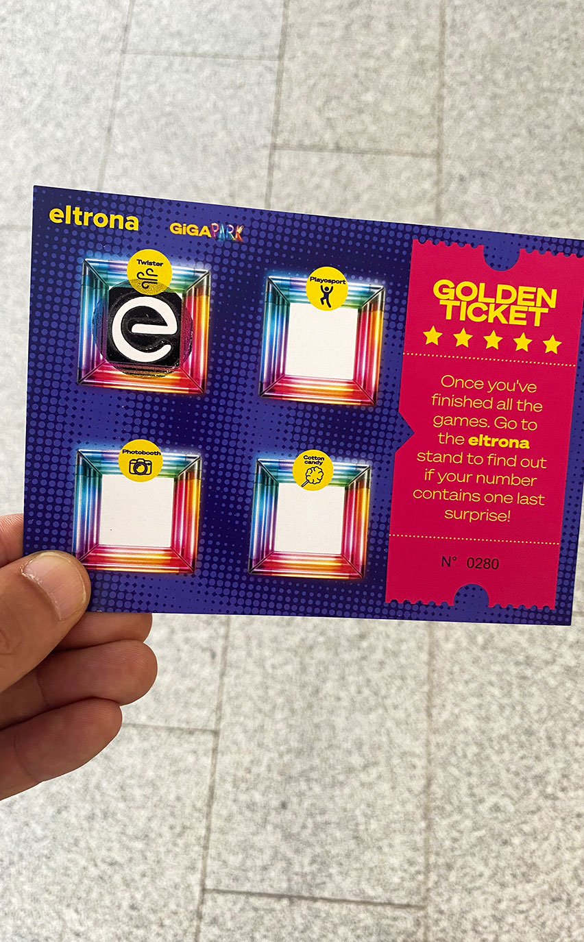 Pour accéder au GIGA PARK, le participant devait récupérer son GIGA PASS numéroté sur le stand commercial Eltrona. Chaque activité réalisée était validée par un tampon, et une fois le GIGA PASS complété, le participant devait se rendre au stand Eltrona pour savoir s’il avait gagné le Golden Ticket.