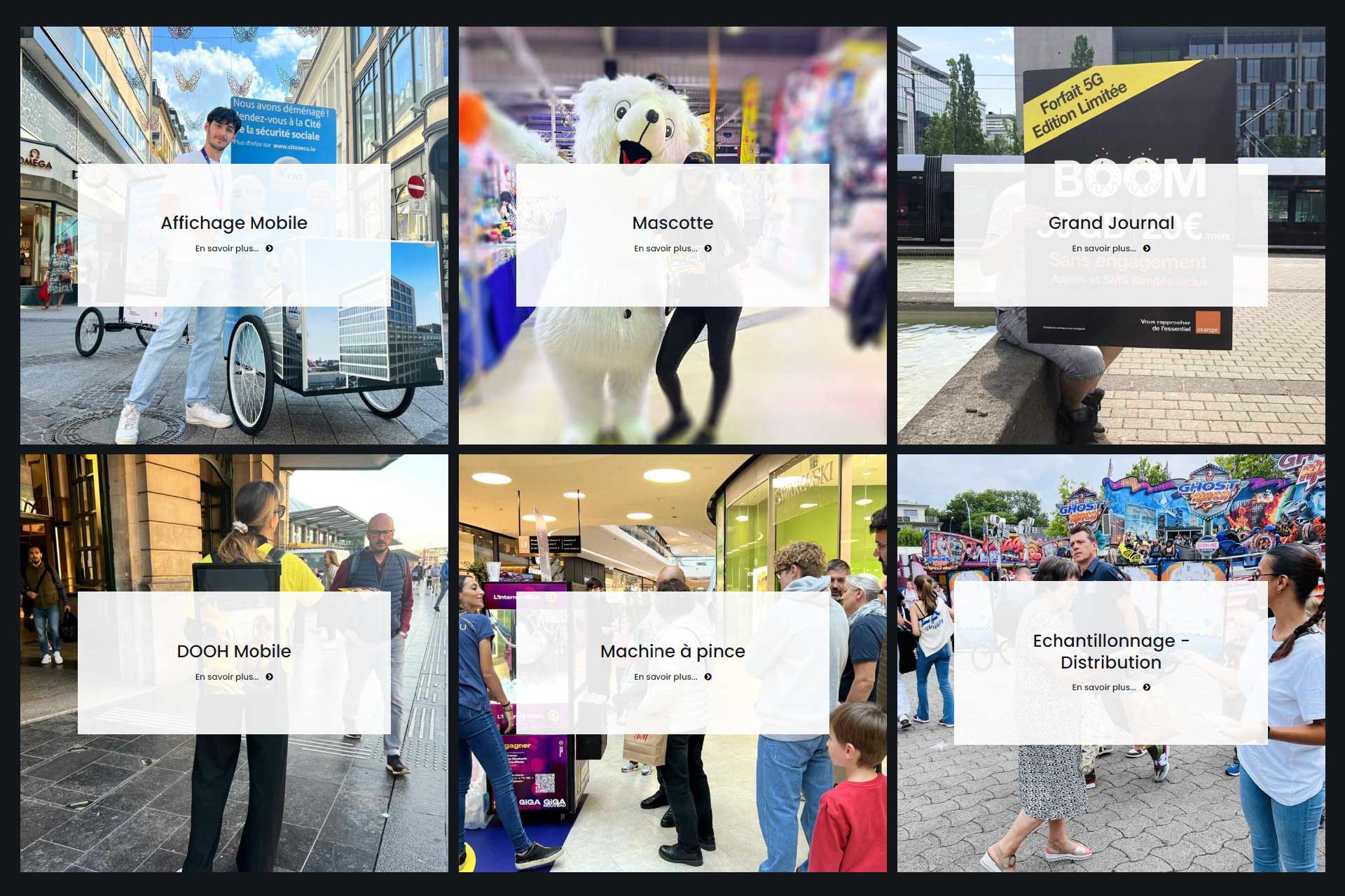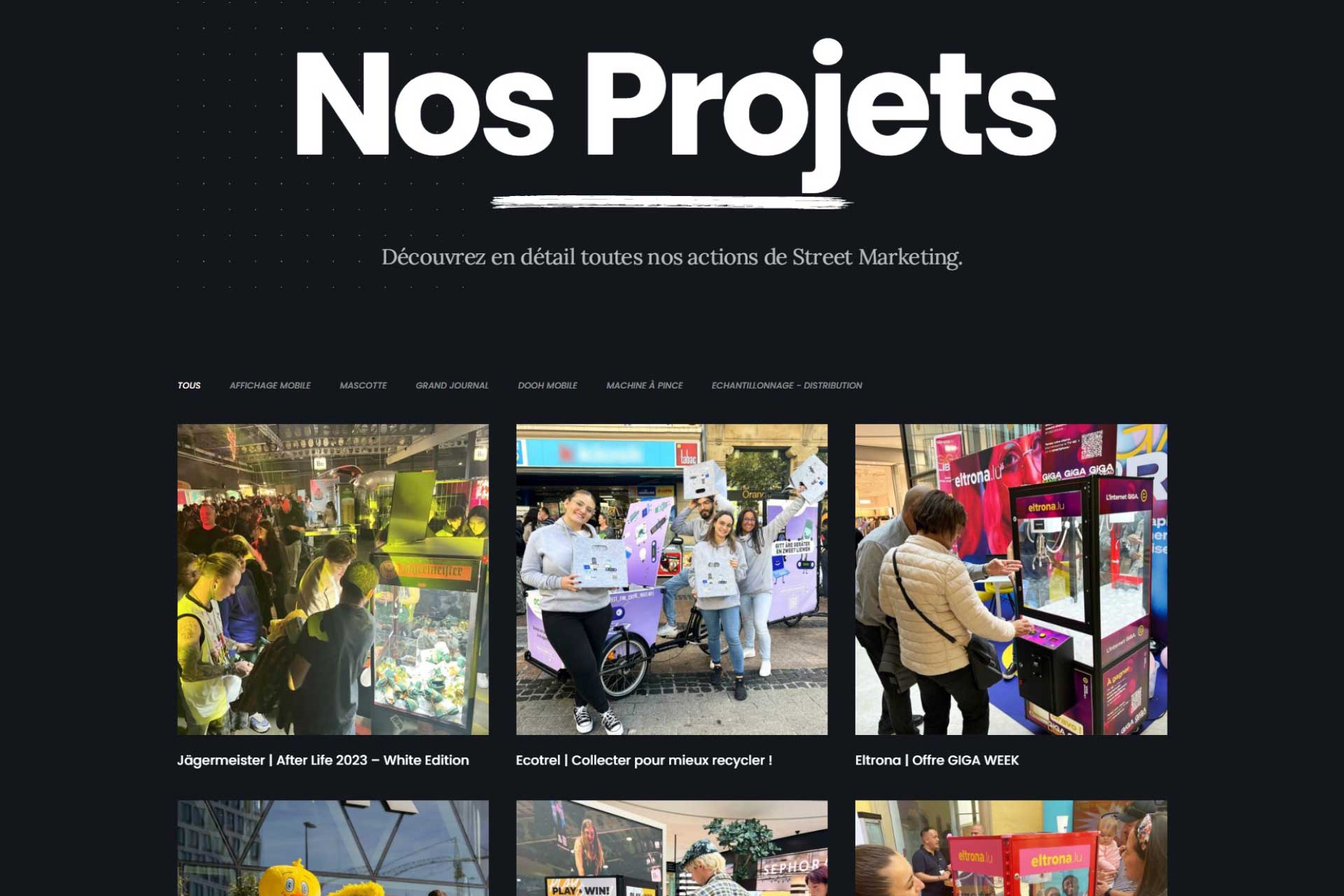 Le street marketing c’est avant tout des actions sur le terrain ! C’est pourquoi nous avons pensé notre nouveau site autour des études de cas réalisées. Par exemple, pour chaque page « Service », nous avons associé les réalisations clients correspondantes pour que vous visualisiez une illustration concrète du service présenté. Vous avez également la possibilité de consulter l’ensemble de nos études de cas avec la possibilité de les filtrer par service.